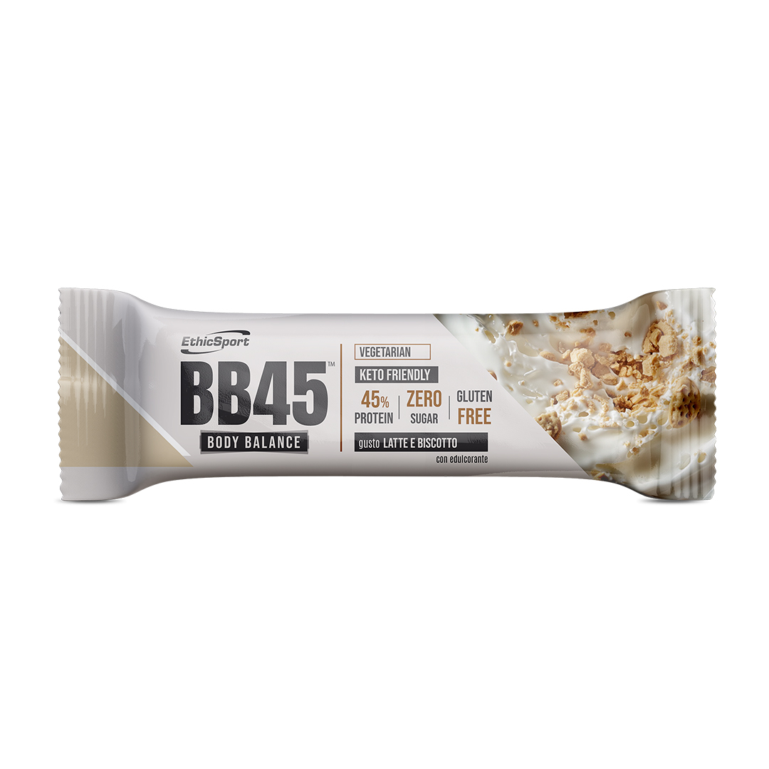 BB45 – Body Balance μπάρα πρωτεΐνης με 45% πρωτεΐνη γάλακτος, μηδενικά σάκχαρα, κατάλληλη για κετογονικές δίαιτες, χορτοφαγική και χωρίς γλουτένη.